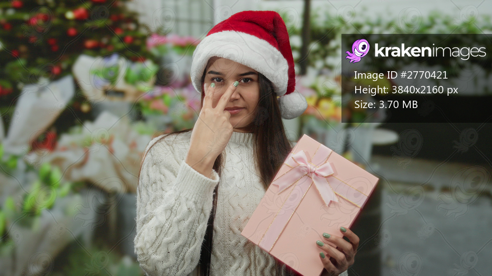 Woman in santa hat holding gift in flower shop gestures and smiles with flowers visible outdoors during festive season.