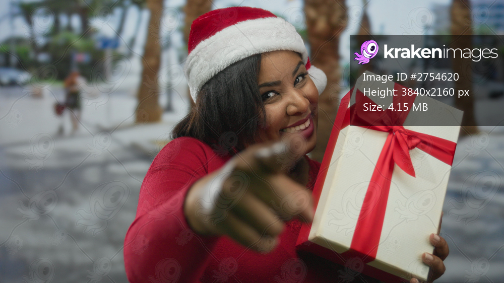 Woman in santa hat holding gift smiles on city street during christmas season pointing playfully at camera outdoors.