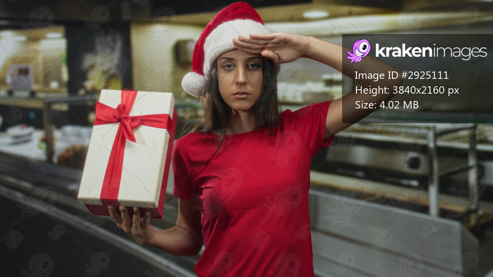Woman in santa hat holding large gift box with hand to brow salute in commercial kitchen; holiday shift duty weariness.