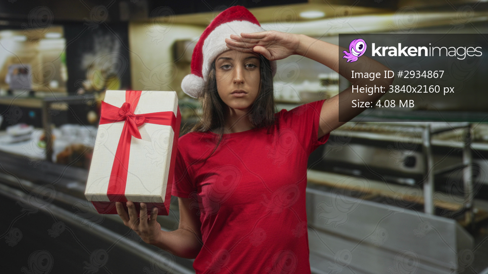 Woman in santa hat holding large gift box with hand to brow salute in commercial kitchen; holiday shift duty weariness.