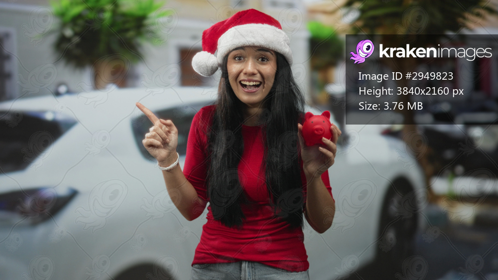 Woman in santa hat holding red piggy bank and pointing finger on a street with parked car; festive savings.