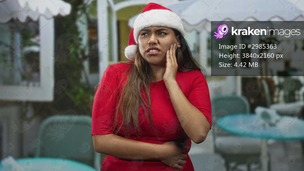 Woman in santa hat holds cheek with hand and clutches stomach outside building; seasonal holiday discomfort.