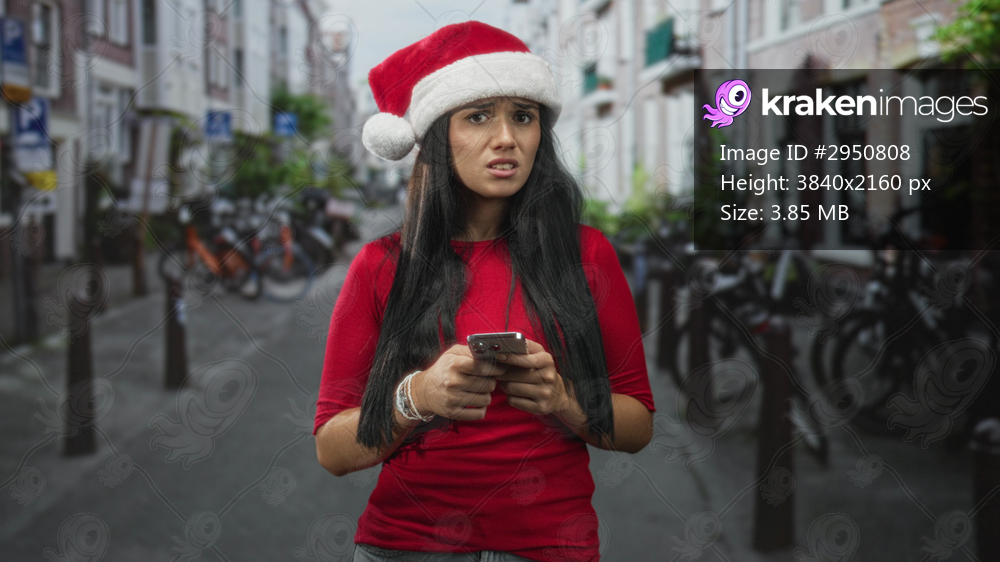 Woman in santa hat holds phone with both hands, pout expression on face in a narrow street wearing red top; holiday melancholy.