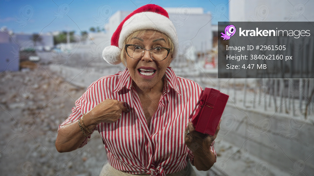 Woman in santa hat holds red gift box and gestures hand to chest amid a building construction site; holiday surprise.