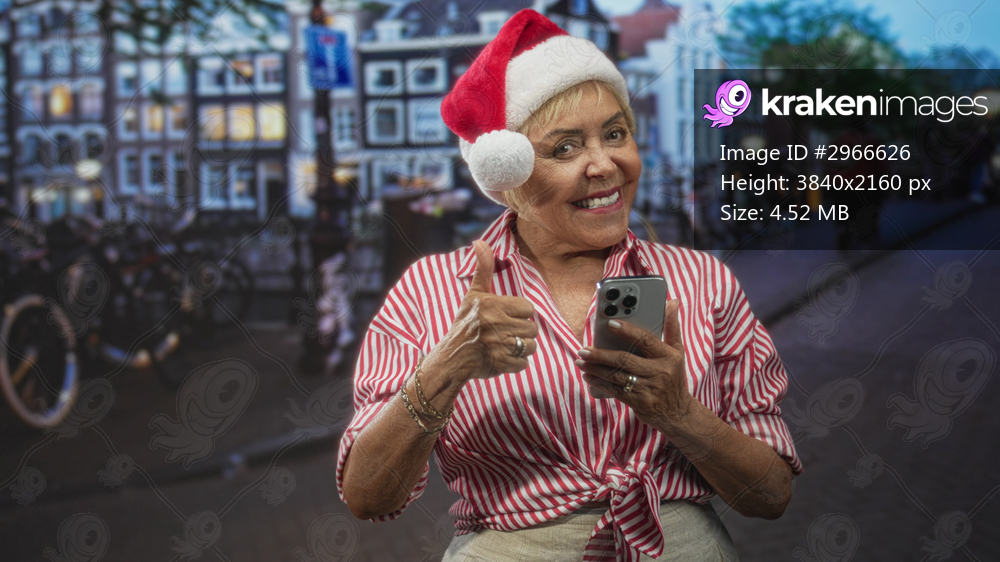 Woman in santa hat holds smartphone and gives thumbs up on a street lined with canal buildings, smiling and checking her phone; holiday joy.