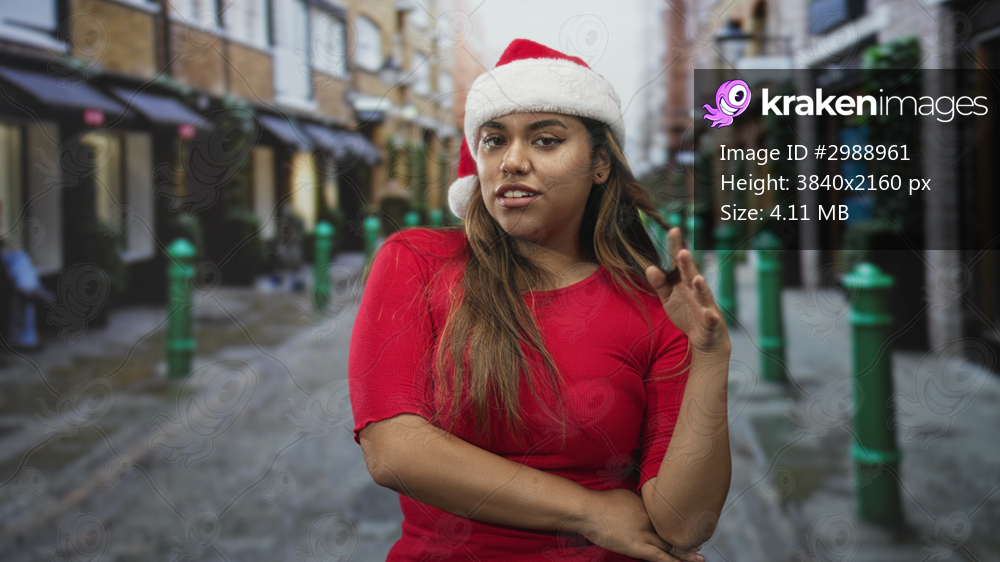Woman in santa hat plays with hair and pouts, hand to hair gesture on a cobbled street with green bollards and shopfronts; playful holiday cheekiness.