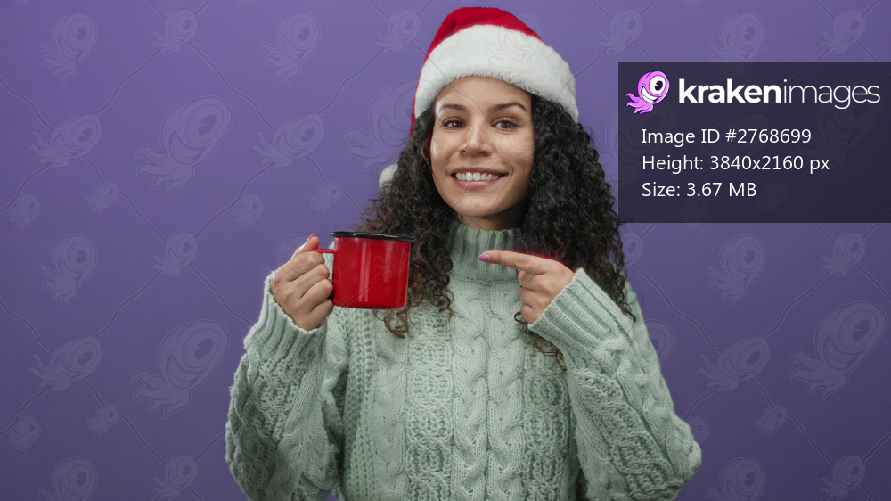 Woman in santa hat pointing at red mug wearing cozy sweater against purple background, smiling cheerfully in festive holiday spirit