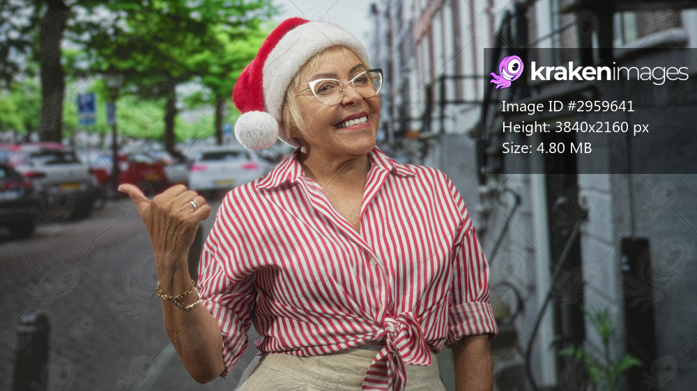 Woman in santa hat points thumb over shoulder on city street, wearing striped knot shirt and smiling while looking sideways; holiday cheerful.