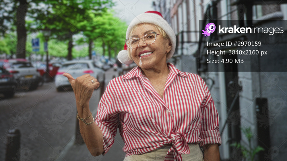 Woman in santa hat points thumb over shoulder on city street, wearing striped knot shirt and smiling while looking sideways; holiday cheerful.