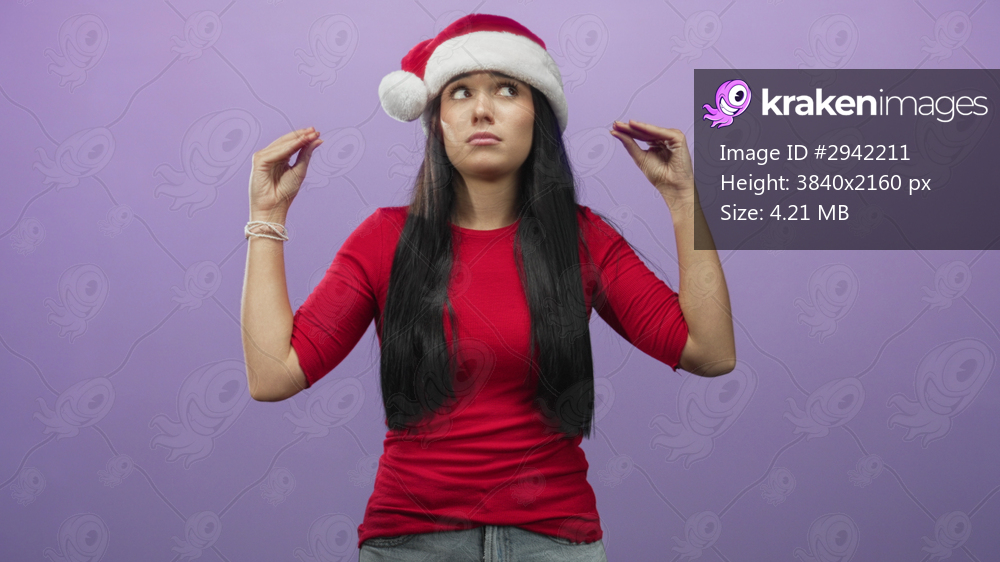 Woman in santa hat raises hands with palms visible and worried expression in studio; holiday frustration.