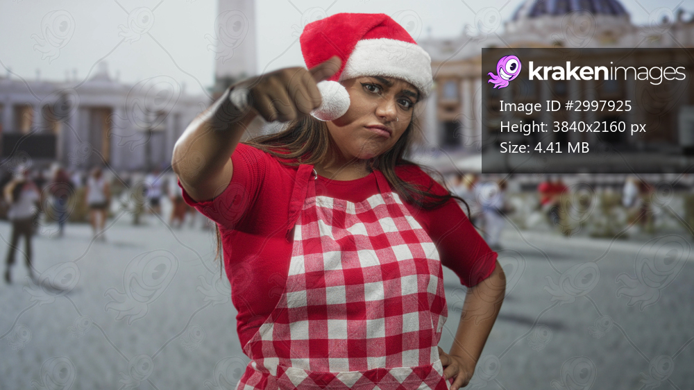 Woman in santa hat and red check apron gives thumbs up at camera in a crowded street by a monumental plaza with colonnades and obelisk; festive.