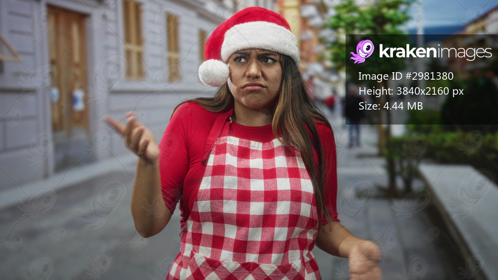 Woman in santa hat and red check apron shrugs and crosses arms on a city street with storefronts, bench and tree; holiday confusion.