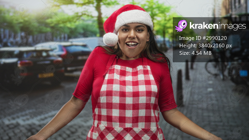 Woman in santa hat and red checked apron points finger on street while smiling with closed eyes; festive joy.