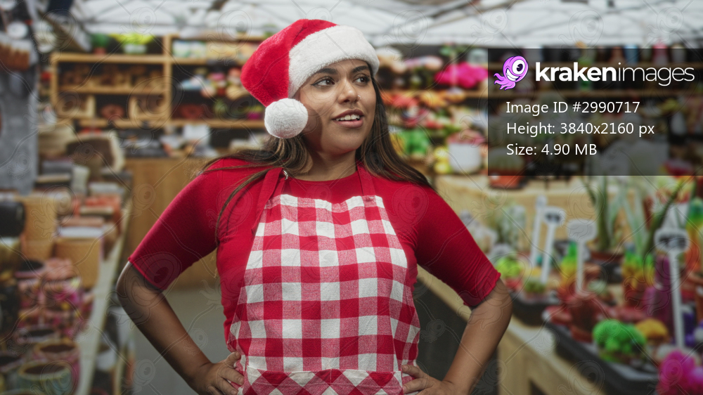 Woman in santa hat and red checkered apron stands with hands on hips among plant pots and ceramics in holiday market; festive cheer.