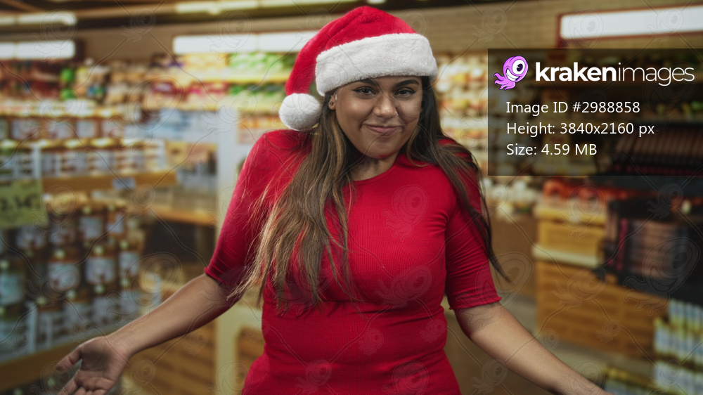 Woman in santa hat and red shirt covers mouth and claps in grocery building aisle; holiday seasonal surprise.