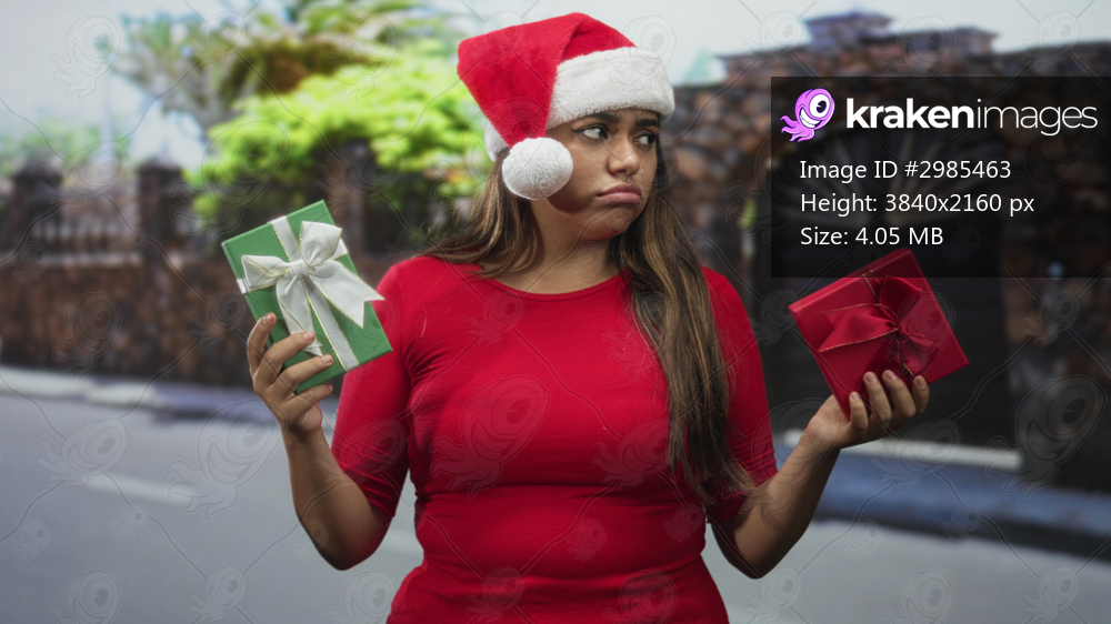 Woman in santa hat and red top holding two wrapped gifts and pouting with hands raised on street; holiday disappointment.
