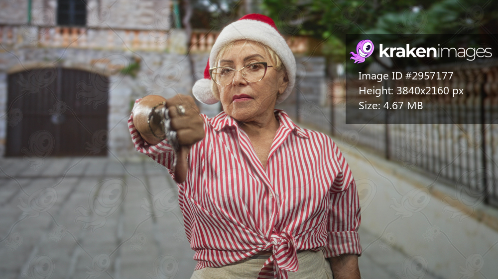 Woman in santa hat shows thumbs down with hand and rings on a street in front of a stone building; firm disapproval.