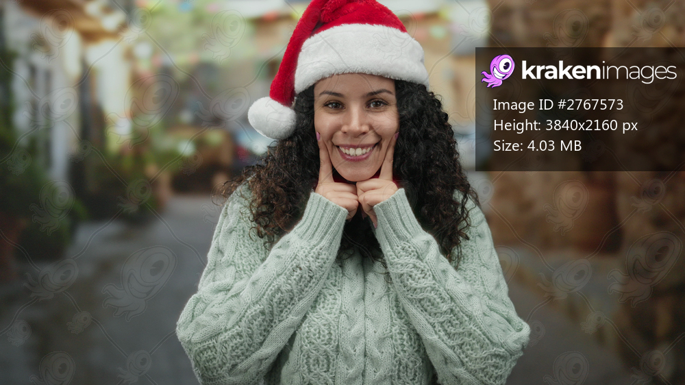 Woman in santa hat smiling in festive outdoor street scene with a cheerful expression celebrating the holiday season.