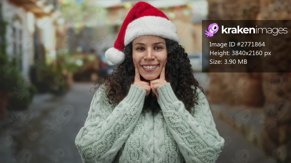 Woman in santa hat smiling in festive outdoor street scene with a cheerful expression celebrating the holiday season.
