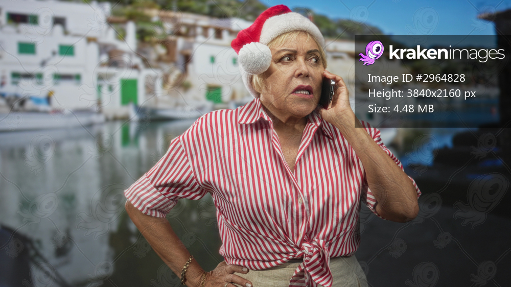 Woman in santa hat and striped shirt holds phone to ear with hand on hip by a waterfront building and moored boats, showing worried expression; holiday concern. - Kraken Images