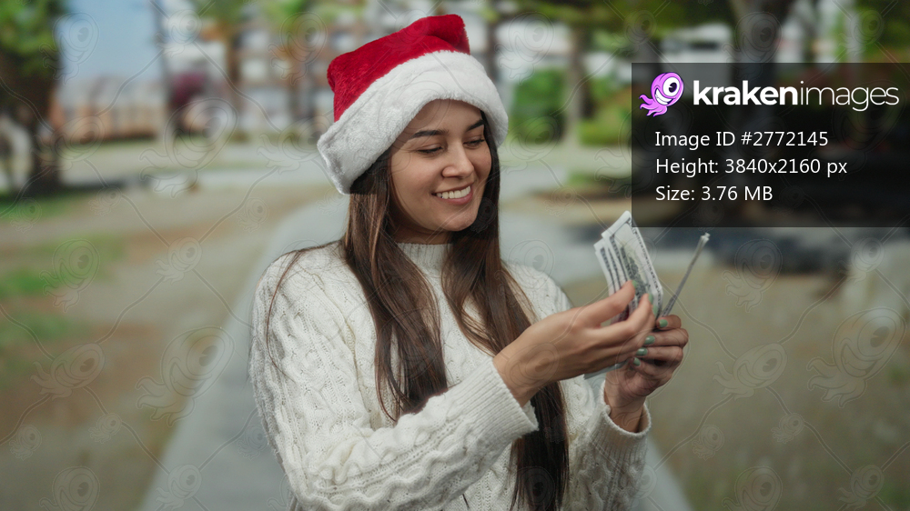 Woman in santa hat and sweater counting dollars outdoors in park, smiling and enjoying holiday season.