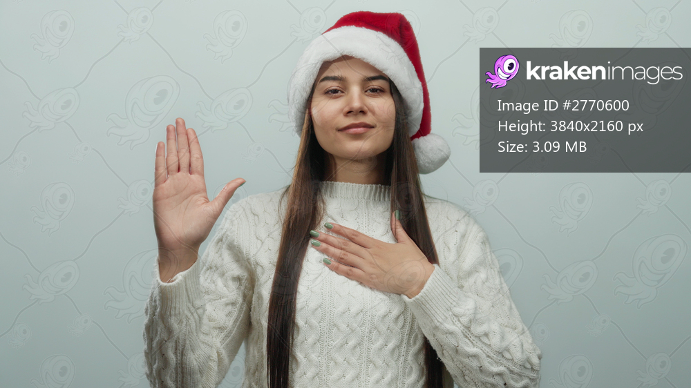 Woman in santa hat and sweater pledging allegiance over white background