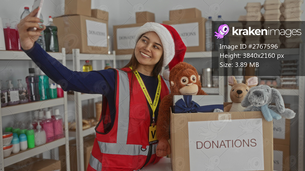 Woman in santa hat taking selfie in charity donation center surrounded by boxes and stuffed animals during holiday season.