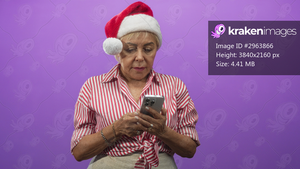 Woman in santa hat taps smartphone with hands against purple studio backdrop wearing striped shirt and bracelets; quiet contemplation.