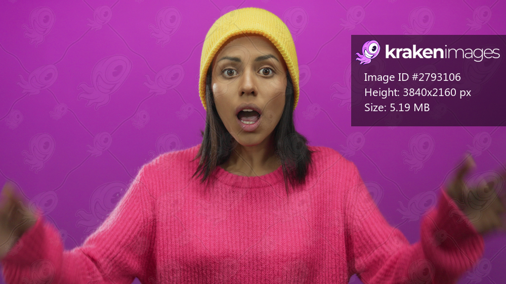 Woman in shock wearing pink sweater and yellow hat against vibrant pink background expressing surprise and disbelief with hands raised in a dramatic gesture - Kraken Images