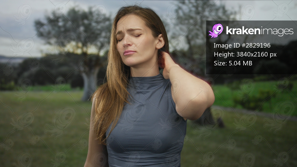 Woman in sleeveless gray top with hand pressing her neck in a green park with olive trees; discomfort tension.