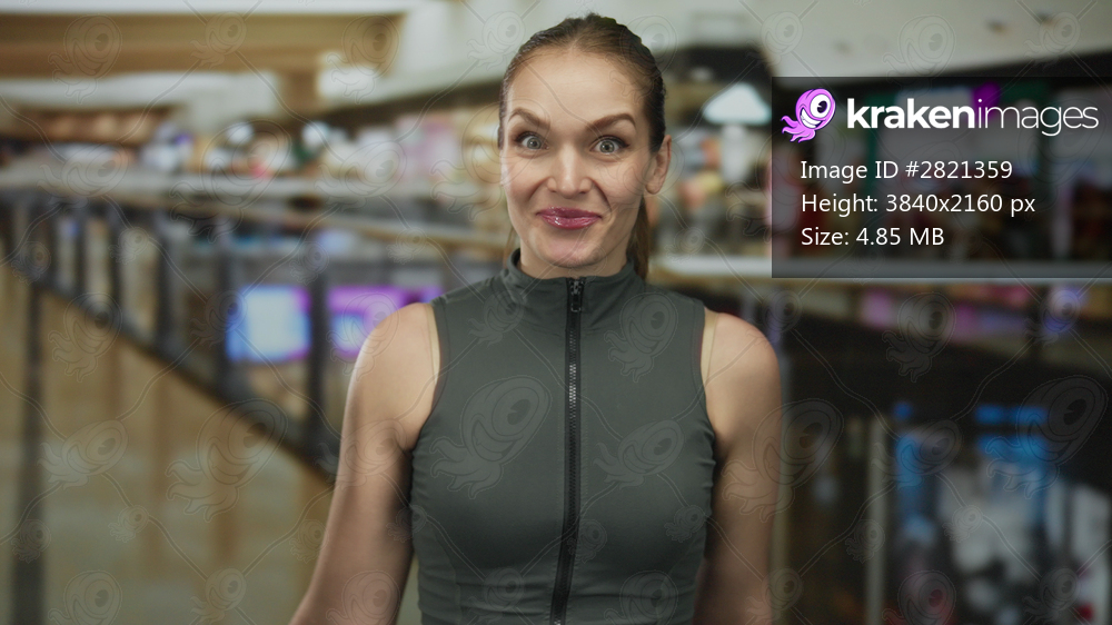 Woman in sleeveless top with bare arm lifts hand to forehead with a subtle smile in building lobby with blurred shops behind; relief.