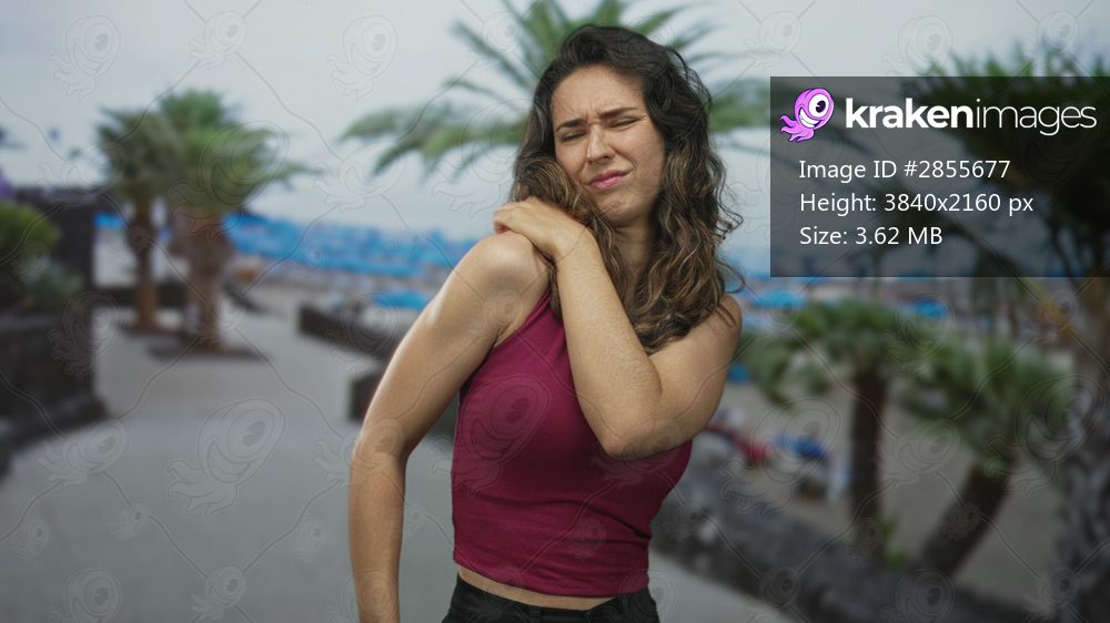 Woman in sleeveless top holding shoulder beside palm trees on beach street while wincing from muscle strain; pain.