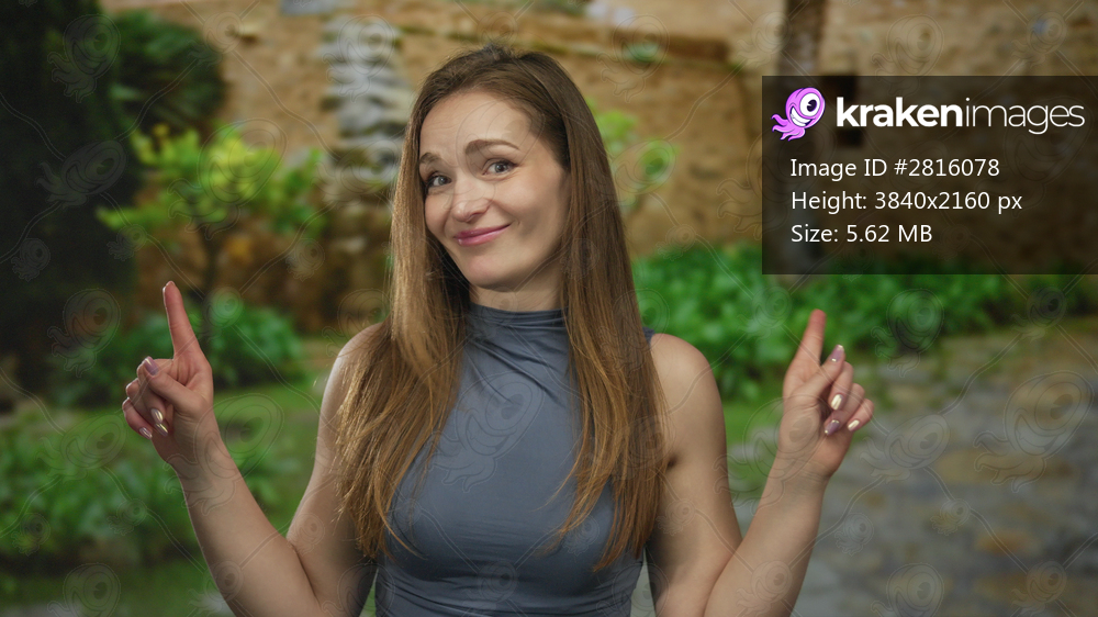 Woman in sleeveless top pointing index finger on cobblestone street of old town with stone wall and foliage backdrop; doubt.
