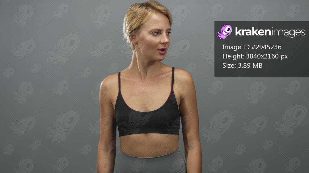 Woman in sports bra gasps with hands to mouth showing smartwatch in studio; surprise celebration achievement.