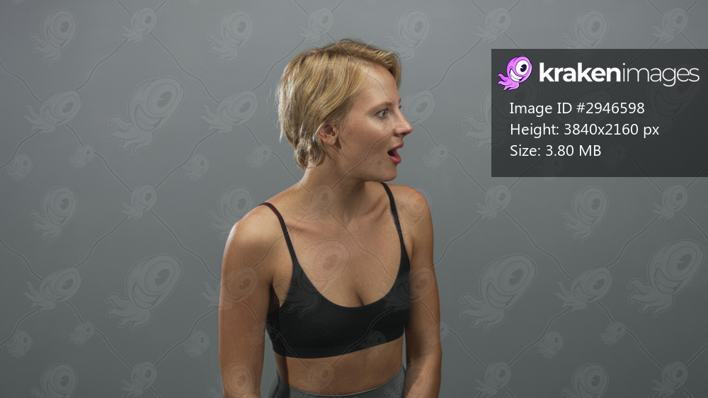 Woman in sports bra gasps with hands to mouth showing smartwatch in studio; surprise celebration achievement.