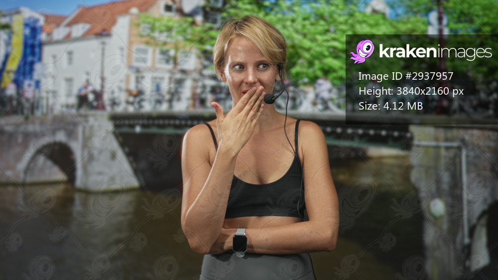 Woman in sports bra with headset covers mouth with hand on a street bridge over a canal near bikes and buildings; playful coaching.