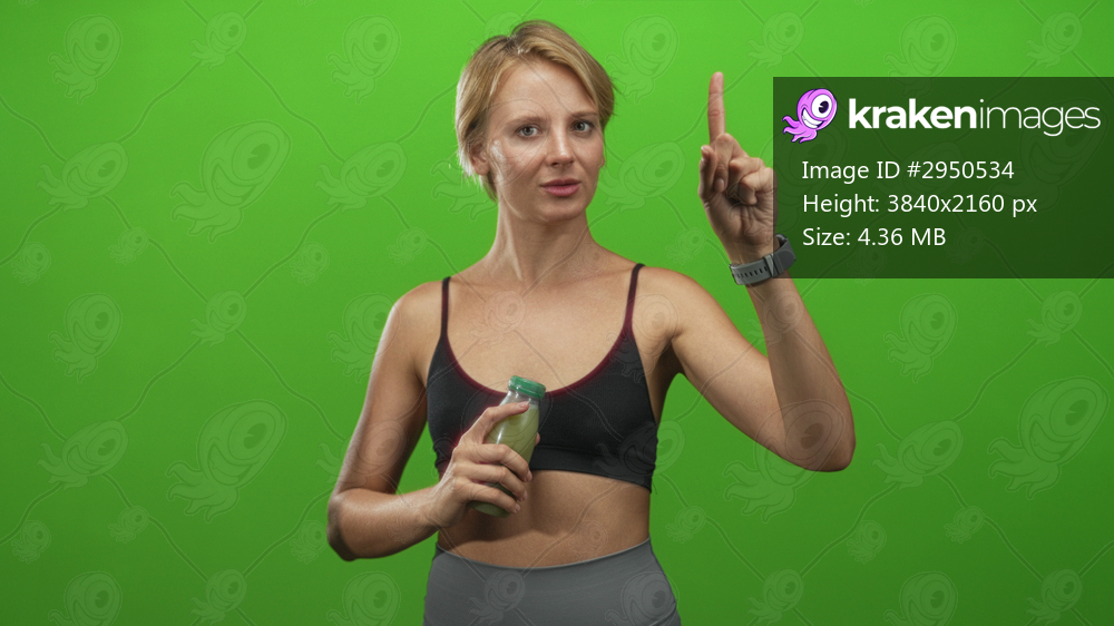 Woman in sports bra holding green juice bottle, showing three fingers with smartwatch on wrist in studio; health vitality confidence wellbeing.