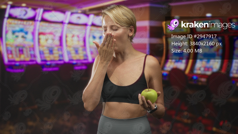 Woman in sports bra holds green apple and coughs into fist inside casino building near glowing slot machines; nausea temptation.