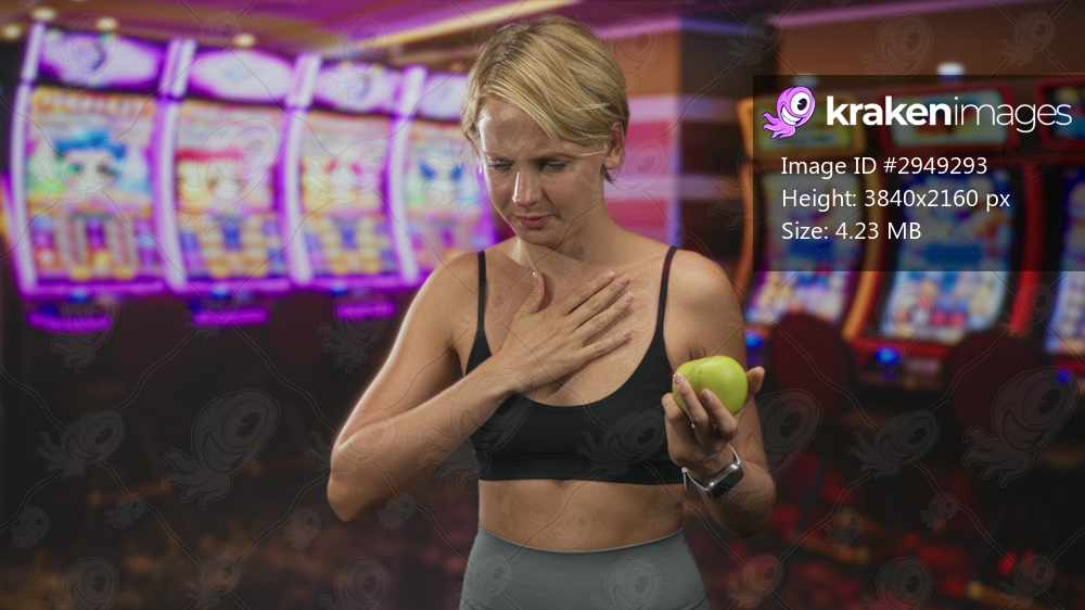 Woman in sports bra holds green apple and coughs into fist inside casino building near glowing slot machines; nausea temptation.