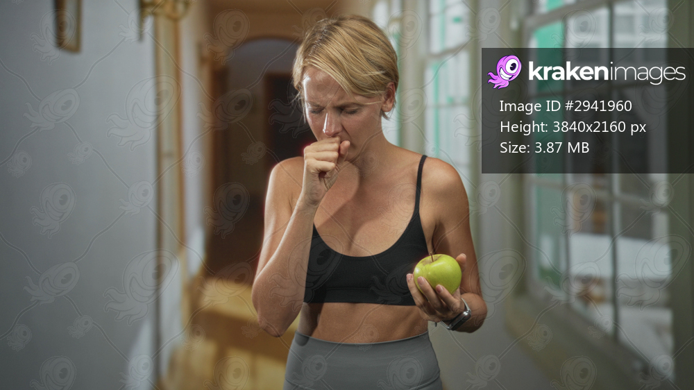 Woman in sports bra holds green apple and places hand on chest in a building corridor; calm mindful nutrition.