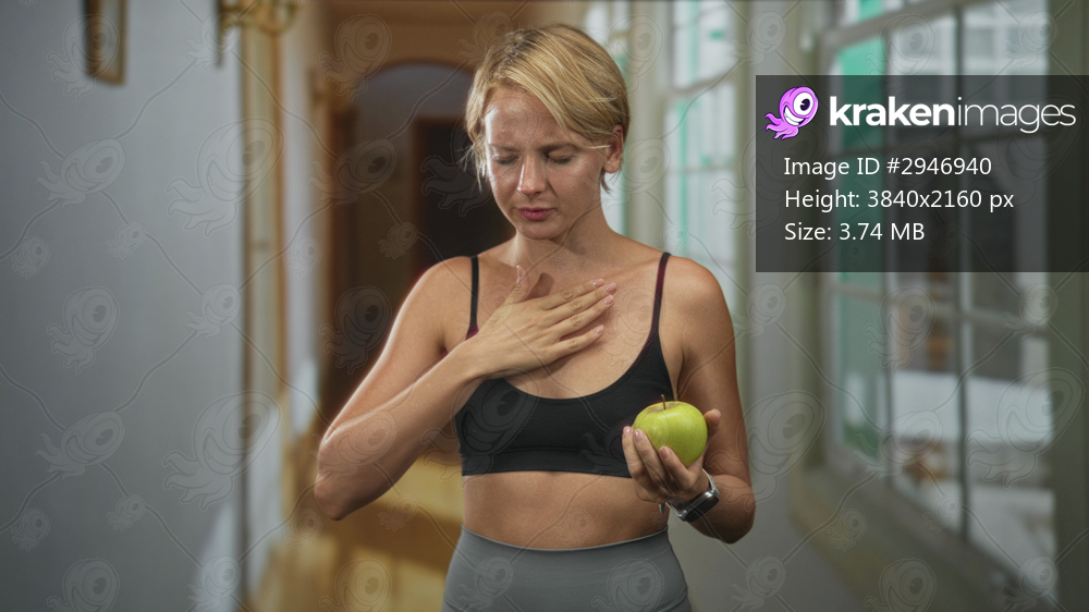 Woman in sports bra holds green apple and places hand on chest in a building corridor; calm mindful nutrition.