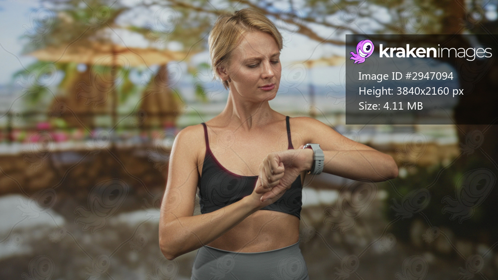 Woman in sports bra points finger to smartwatch on wrist in studio while smiling and showcasing wearable tech for fitness consumers; confidence wellness timing. - Kraken Images
