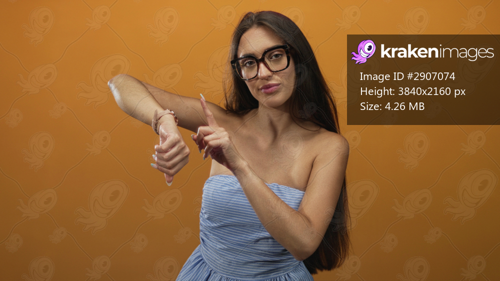Woman in strapless blue dress and glasses pointing to watch on her wrist in an orange studio; impatience punctuality time awareness.