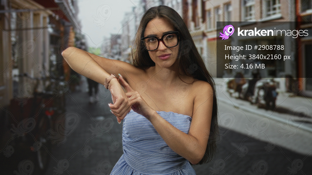 Woman in strapless blue dress and large glasses checks her watch and shrugs bare shoulders on a busy street; impatience waiting.