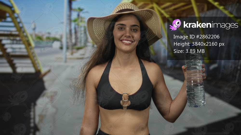Woman in straw hat and bikini top shows midriff and holds water bottle on sunlit street; summer hydration happiness.