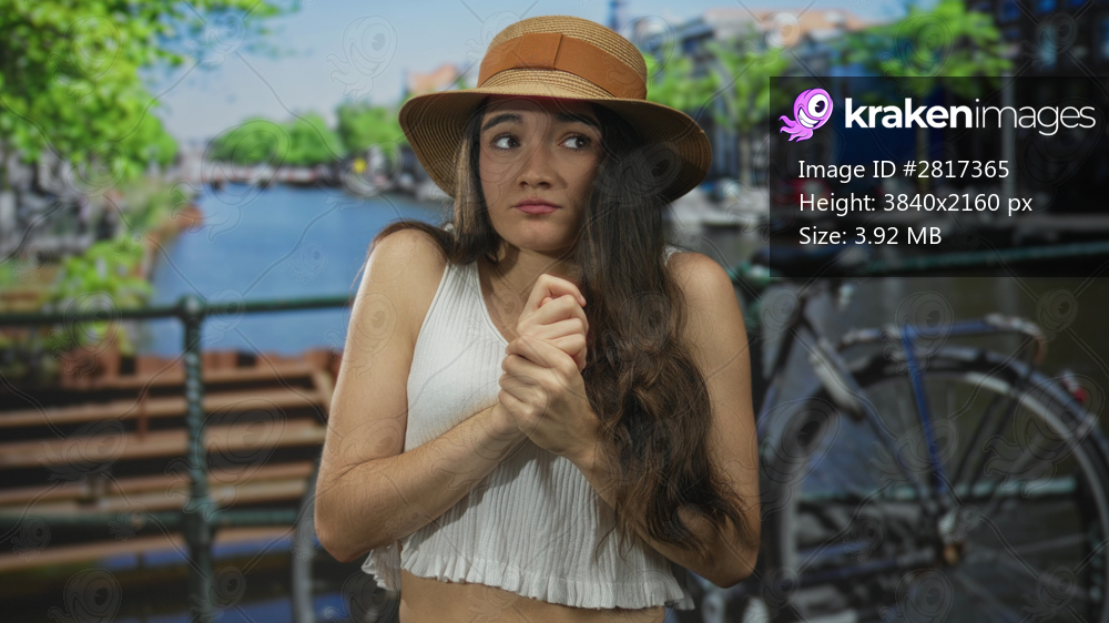 Woman in straw hat clasping hands by canal railing on bustling street in summer sunlight amid bicycles; nervousness.