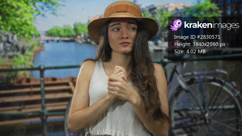 Woman in straw hat clasping hands by canal railing on bustling street in summer sunlight amid bicycles; nervousness.