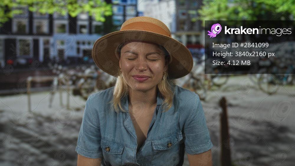 Woman in straw hat and denim shirt holds stomach with closed eyes and pained expression on cobblestone street; pain.