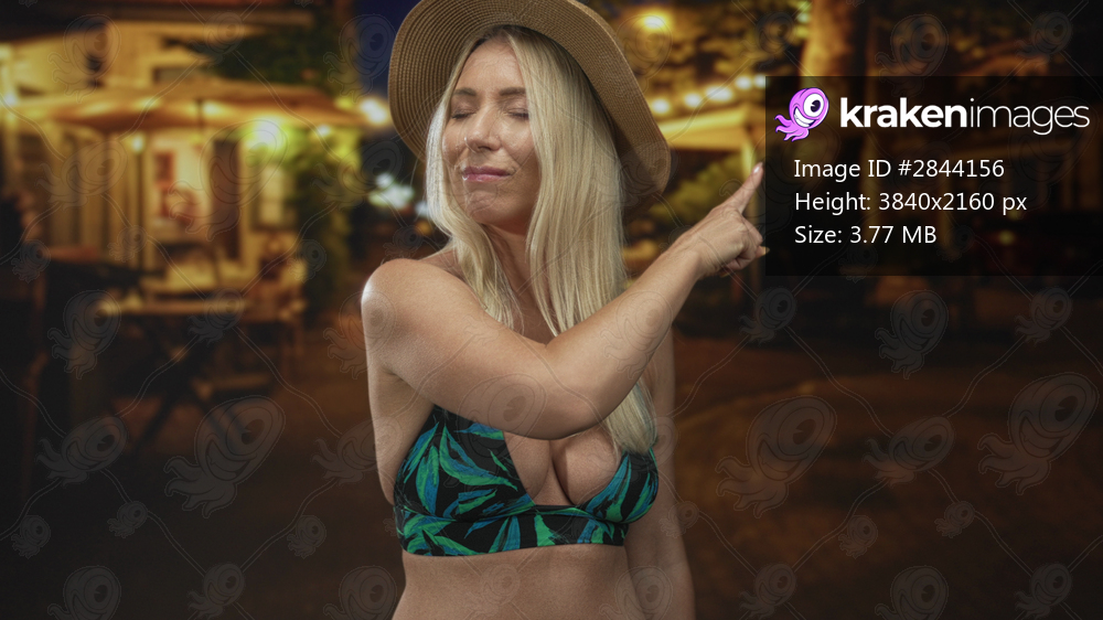 Woman in straw hat pointing finger to the side on city street at night under warm lights; assertive defiance.