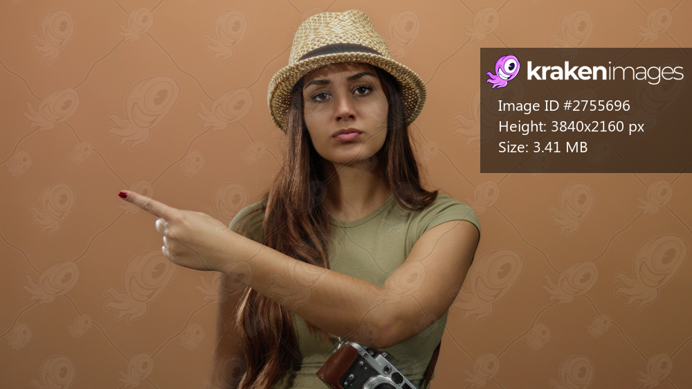 Woman in straw hat points assertively in front of a brown background, embodying a confident tourist vibe, with a vintage camera hanging around her neck. - Kraken Images